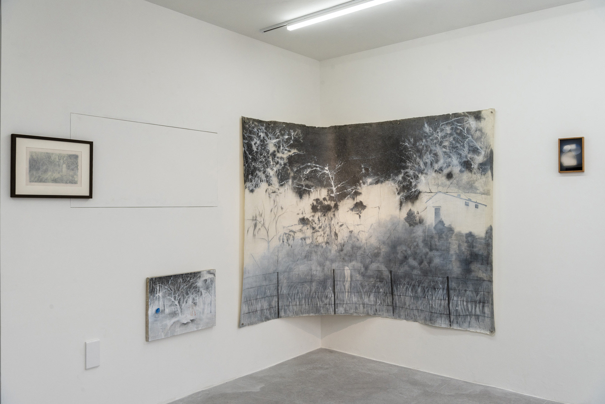 박명미 작가의 <폐가(숲에서)>(2015-2017) 작업은 오름 중턱과 양양에서 동해로 가는 길목에서 우연히 마주했던 숲, 폐가로부터 ‘자본이나 권력에 의해 밀려나는 풍경’을 떠올린 경험에서 착안되었다. 작가는 회화 작업에서 연필, 파스텔, 아크릴을 주요한 매체로 삼는데, 이는 친숙하고 검소한 재료의 무한한 가능성을 향한 포용적 태도에 기반을 두고 있다. 얇은 필선과 옅은 푸른 색감을 배경으로, 지우기와 그리기로 덧입혀진 숲과 폐가의 모습은 우리로 하여금 밀려나는 풍경, 버려진 사물의 그 존재론적 의미를 되새겨보게 한다.